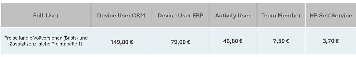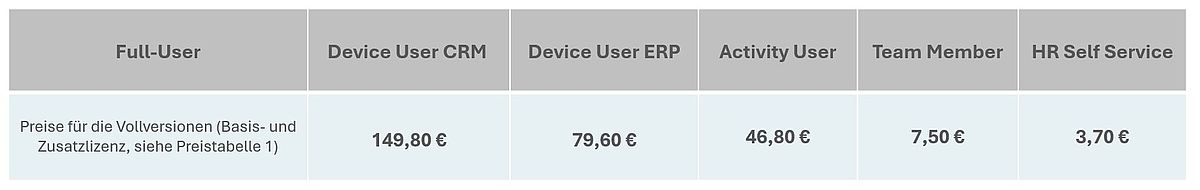 Preistabelle 2: Preise der wichtigsten User-Typen